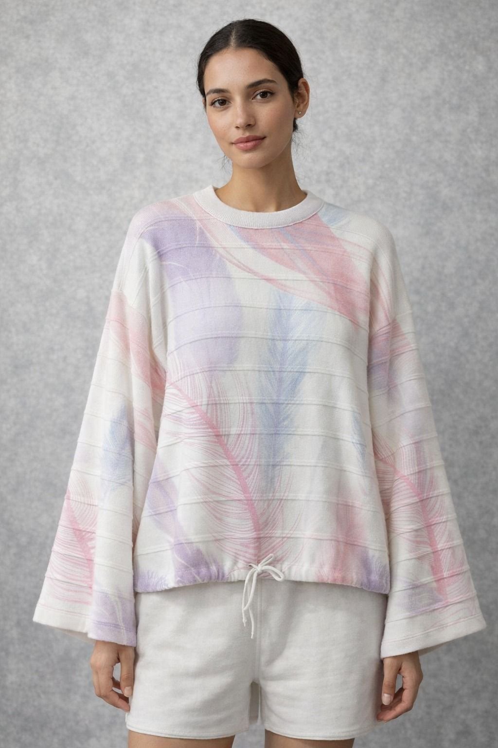 بلوفر مريح بطبعة سبليمشن ريشة بألوان باستيل ناعمة تضيف لمسات أنثوية أنيقة لإطلالتك اليومية. مصمم ليمنحك الراحة والأناقة في نفس الوقت، مما يجعله مثالياً للإطلالات الكاجوال العصرية.